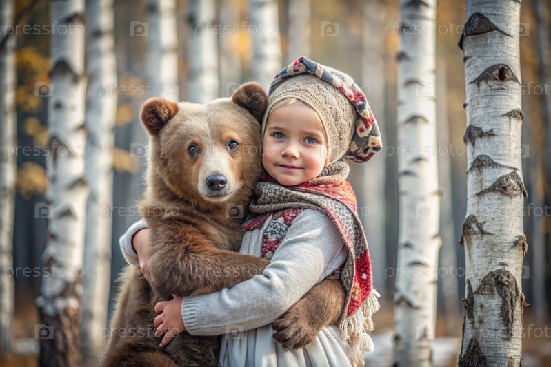 Красивая маленькая девочка в русской народной одежде и с платками на голове в березовой роще с живым медведем Русский фольклор, славянская мифология