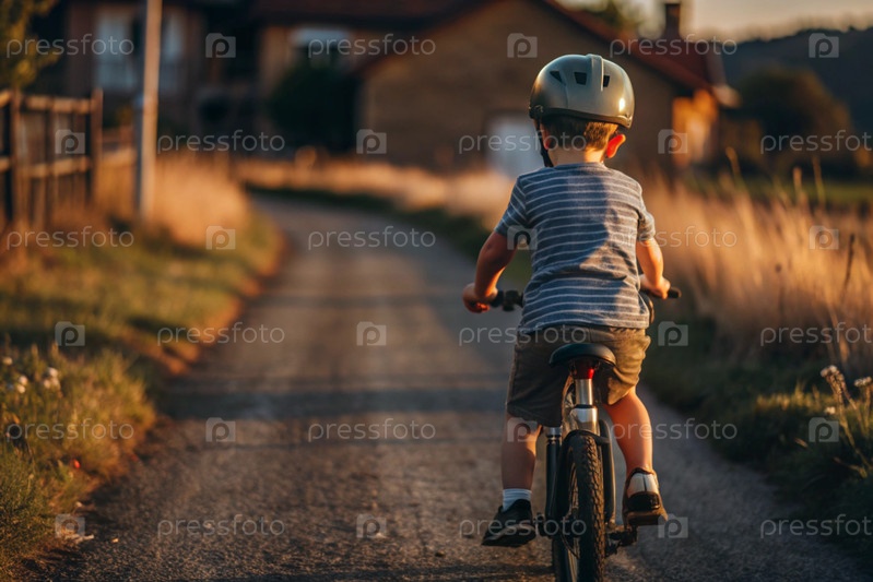 Веселый маленький мальчик катается на велосипеде в шлеме на открытом воздухе. Счастливый ребенок занимается активными видами спорта. Защита. Страхование жизни и безопасность детей