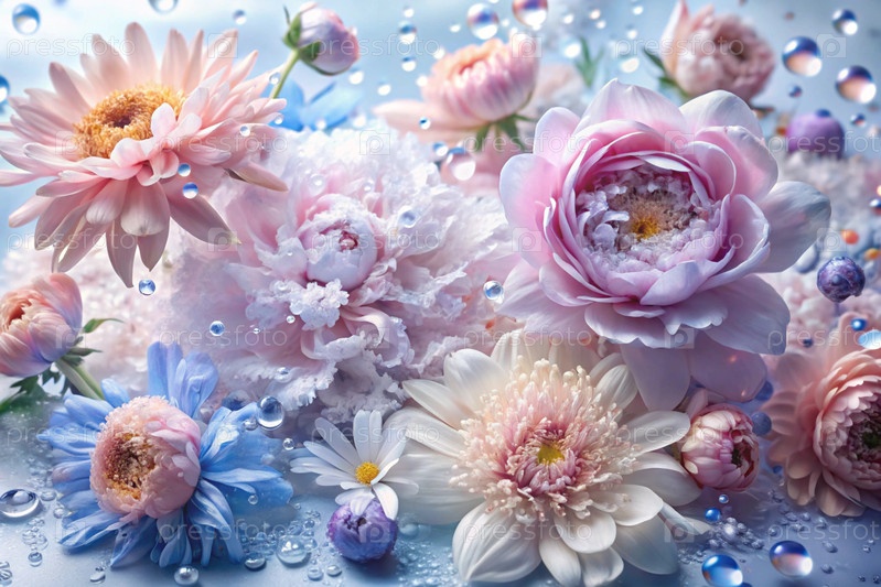 Красивый, воздушный, деликатный цветочный фон в синих и розовых тонах. цветы пиона, хризантемы, ромашки с каплями воды на лепестках