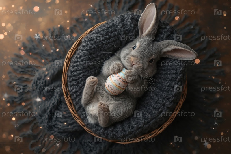 Пасхальный кролик держит пасхальное яйцо в лапах, лежит на спине на сером вязанном одеяле и смотрит в камеру