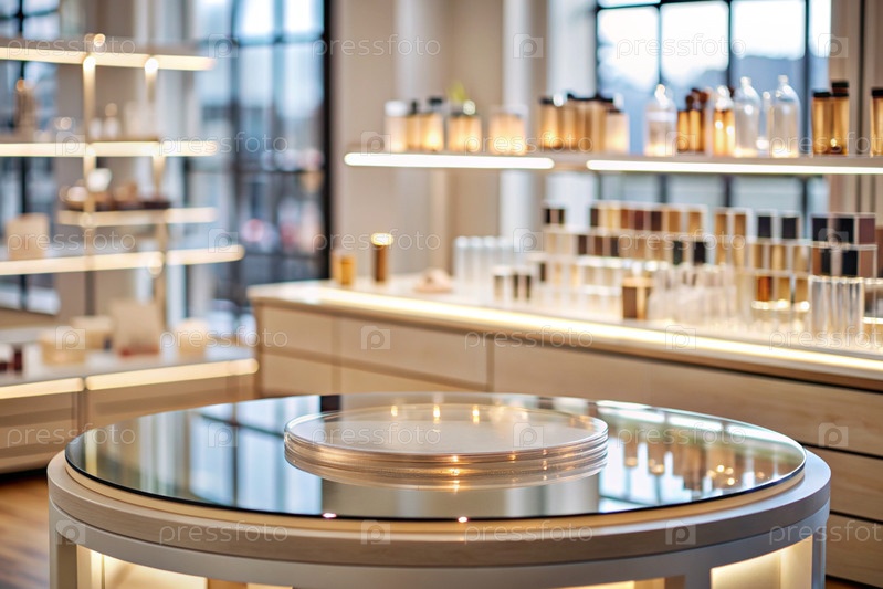 Минимальный фон для демонстрации продукта. Современная стеклянная подиум в современном магазине косметики. Элегантный дизайн для презентации косметической продукции