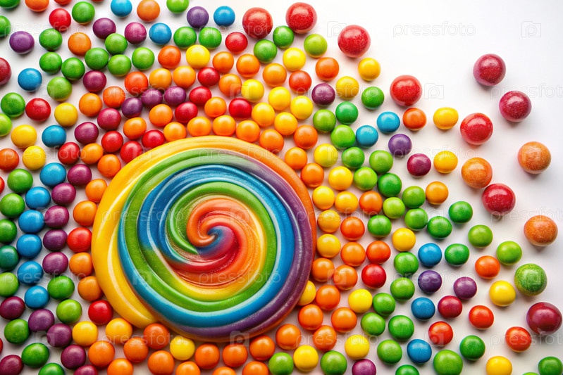 Цветные конфеты в ассортименте на белом фоне. Различные сладости, кондитерские изделия и драже различных форм и цветов. Яркие тени радуги