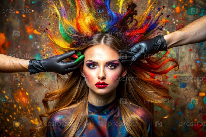 Творческий баннер для салона красоты или парикмахера. Модное профессиональное окрашивание волос. Красивая женщина с длинными многоцветными волосами. Взрыв цветов на голове