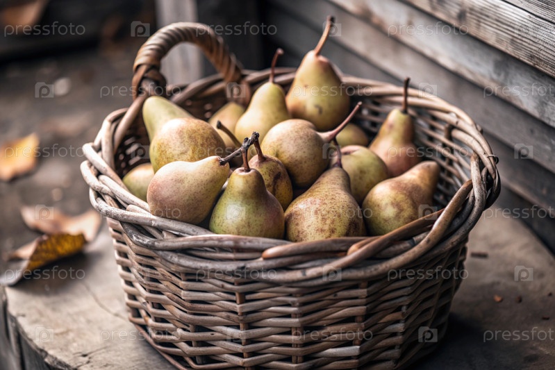 Груша, собранная с ветви дерева в корзину из уксуса, крупный план. Красивое солнечное сияние. осенний урожай