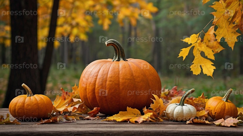 Осенний фон тыквы и осенние листья на фоне леса. Концепция Хэллоуина
