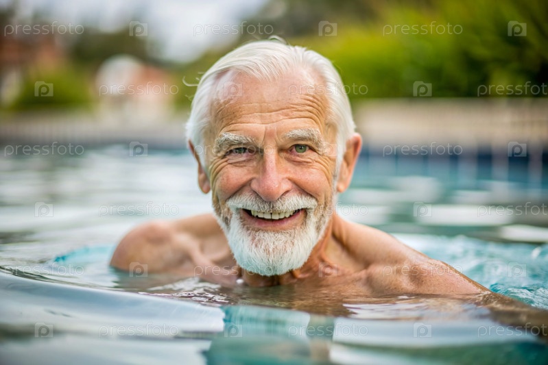 Пожилой мужчина плавает и занимается водной аэробикой в отопительном бассейне, счастливый и улыбающийся пенсионер