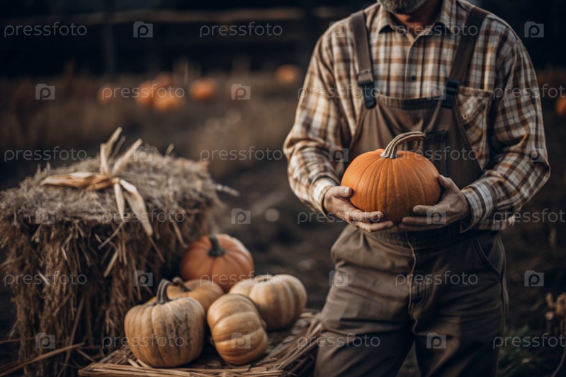 Руки мужчины в квадратной рубашке с тыквенным крупным планом и красивым осенним рисунком. Сбор тыков. Концепция празднования Дня благодарения и Хэллоуина