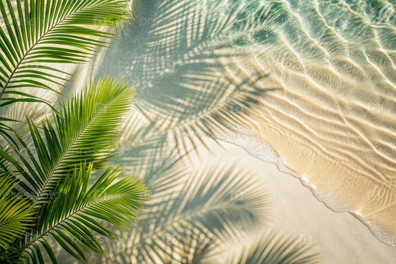Концепция летнего отдыха на пляже. Вид тропических листьев на поверхности воды. Тень пальмовых листьев на белом песчаном пляже. Красивый абстрактный фон для баннера