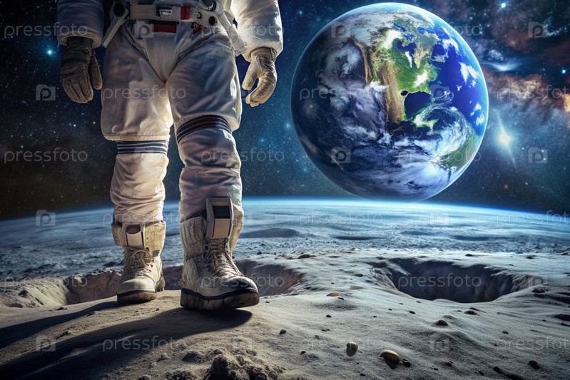 Счастливый День космоса.Астронавты в скафандре на Луне в космическом пространстве.Впечатляющий вид на планету Земля