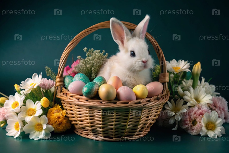 Баннер. пасхальный кролик в плетеновой корзине, наполненной красочными пасхальными яйцами. концепция весенних праздников Пасхи