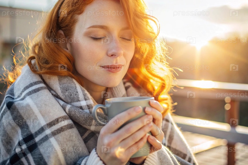Красивая рыжеволосая женщина, завернутая в клетку с кружкой горячего кофе на красивом террасе под лучами заходящего солнца