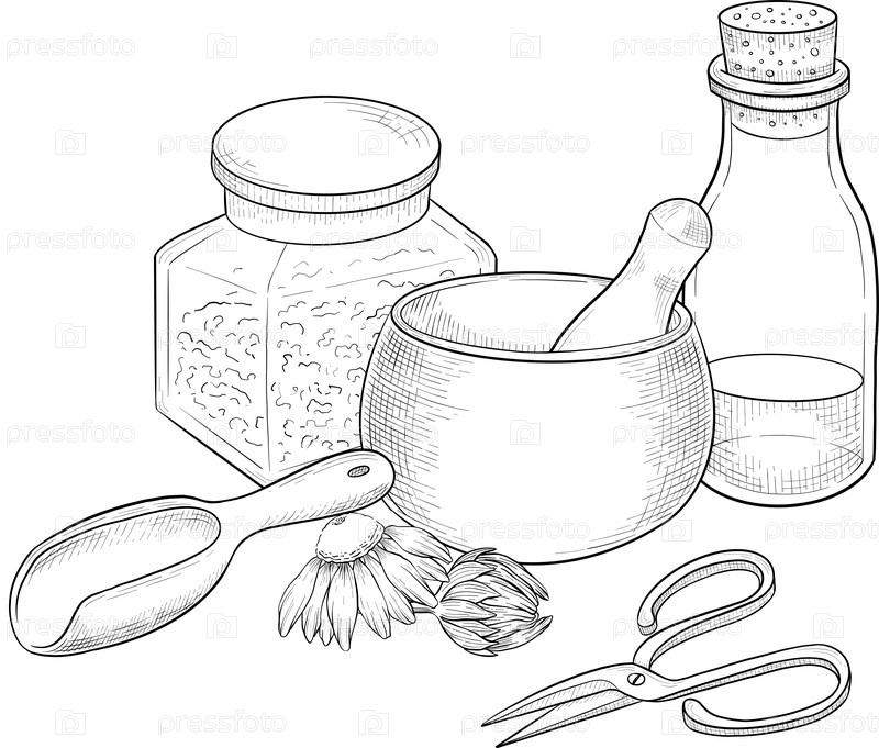 Лекарственные растения для растительной органической настойки. Альтернативная медицина, сбор травы. Векторная иллюстрация в стиле чернила