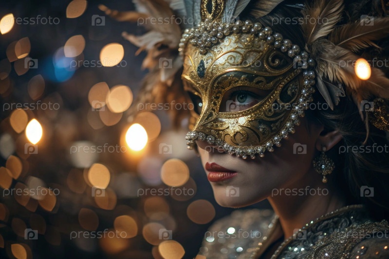 Карнавал Венеции.Закрытие женщины в украшенной карнавальной маске.Яркие цвета передают атмосферу празднования и роскоши