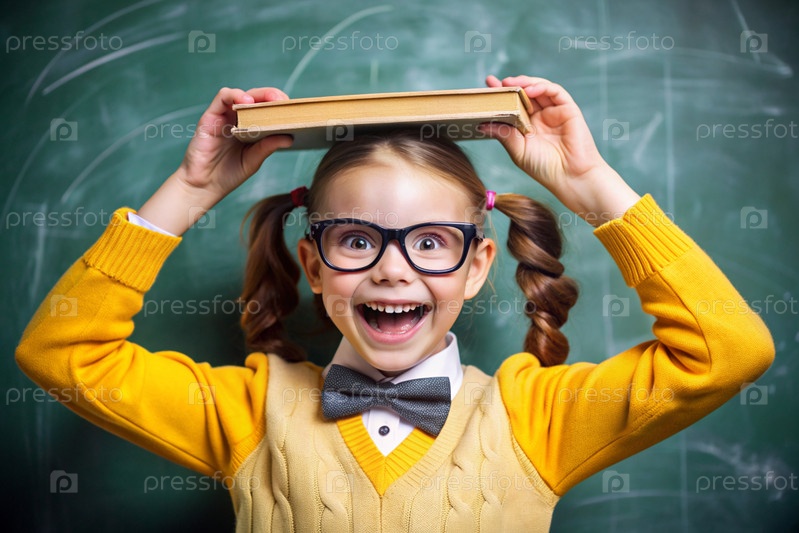 Красивая девушка с очками и книгами на голове. Ребенок впервые идет в школу. Ребёнок в классе со доской на заднем плане. Возвращение к школе