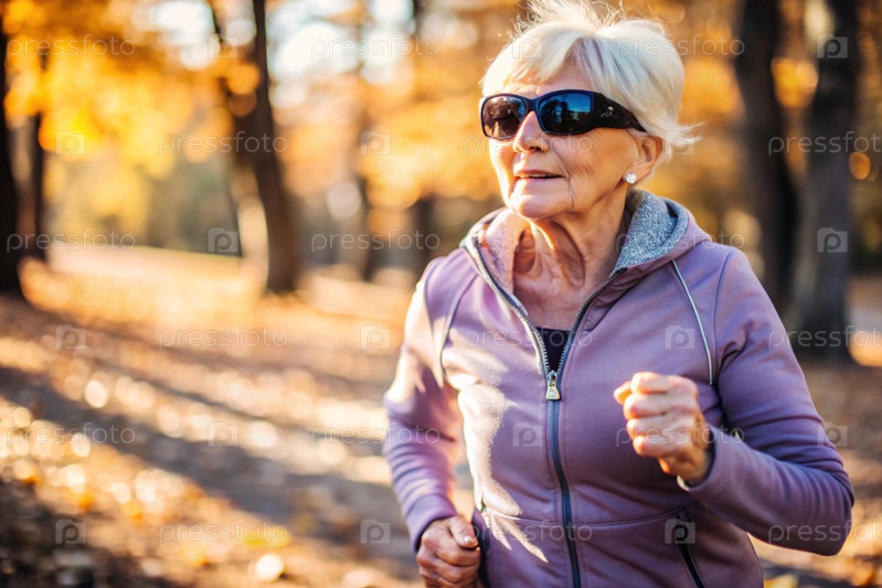 Пожилая женщина бегает по утрам в осеннем парке, счастливый и улыбающийся пенсионер