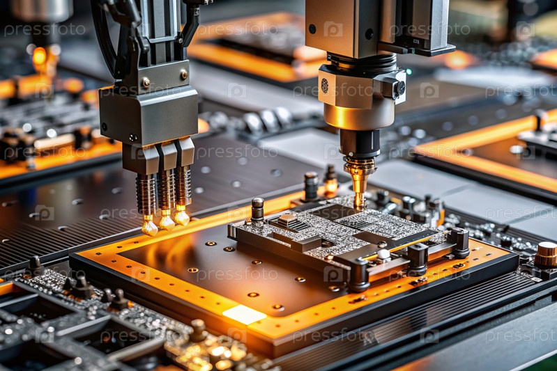 Автоматизированное производство электронных устройств. Современные роботизированные манипуляторы на сборочной линии чипов и печатных платок на современном электротехническом заводе. Установка компонентов на доске
