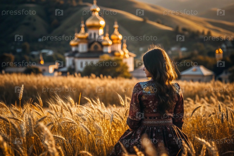 Молодая девушка в льняном платье на фоне поля спелых золотых пшениц и православной церкви при закате солнца