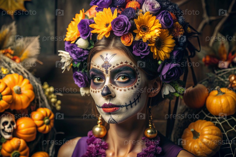 Концепция Хэллоуина. Ужасно. Костюмированная вечеринка. Красивая женщина с покрашенным черепом на лице и цветами на голове. Баннер, открытка