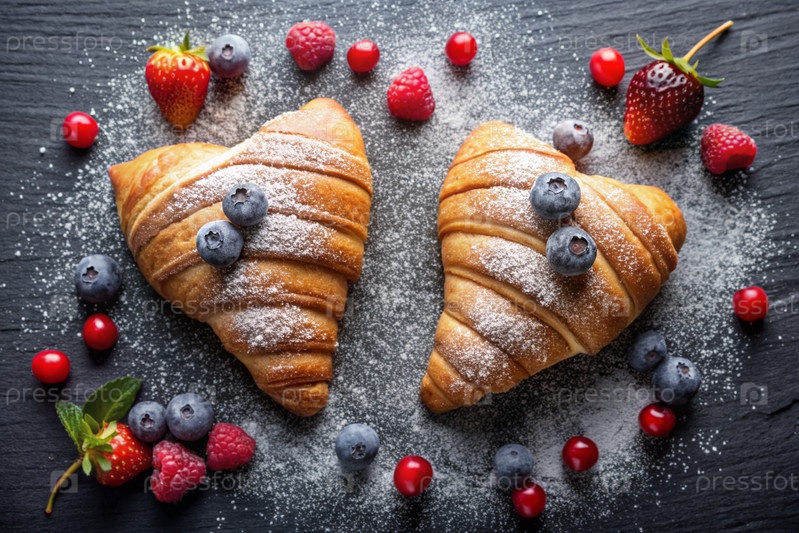 Вкусные свежевыпеченные кроассанты и ягоды в форме сердца на тёмном фоне сланцевого камня. французский завтрак. хорошие ближневые выпечки. пекарня со вкусным хлебом. кондитерские изделия
