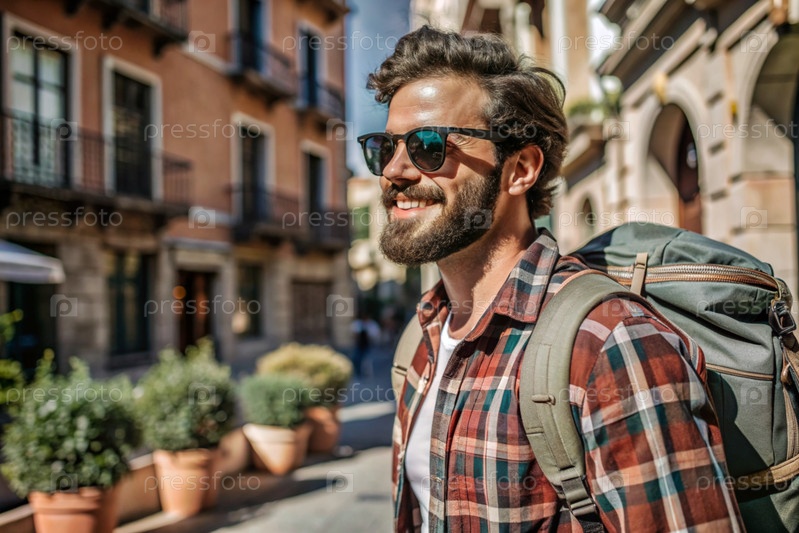 Портрет счастливого красивого хипстера-путешественника с рюкзаком и солнцезащитными очками. Сольное путешествие, образ жизни. Молодой турист наслаждается отдыхом в солнечный день