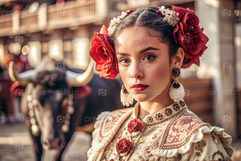 Испанская девушка в традиционном испанском национальном костюме. Перед быком. Бикоборство. Портрет символизирует традиции и культуру народа Испании