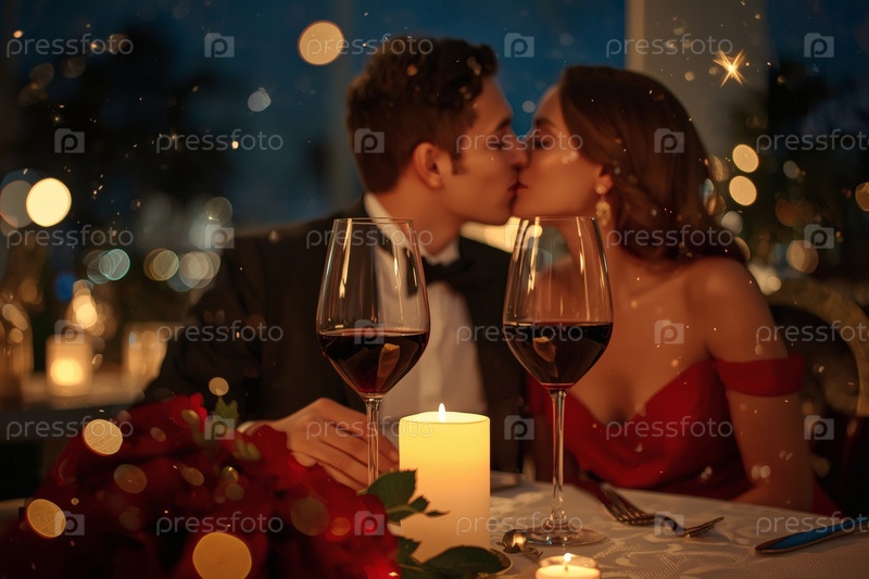 Концепция Дня святого Валентина: элегантная пара, целующаяся на романтическом ужине при свечах с бокалами вина в роскошный вечер