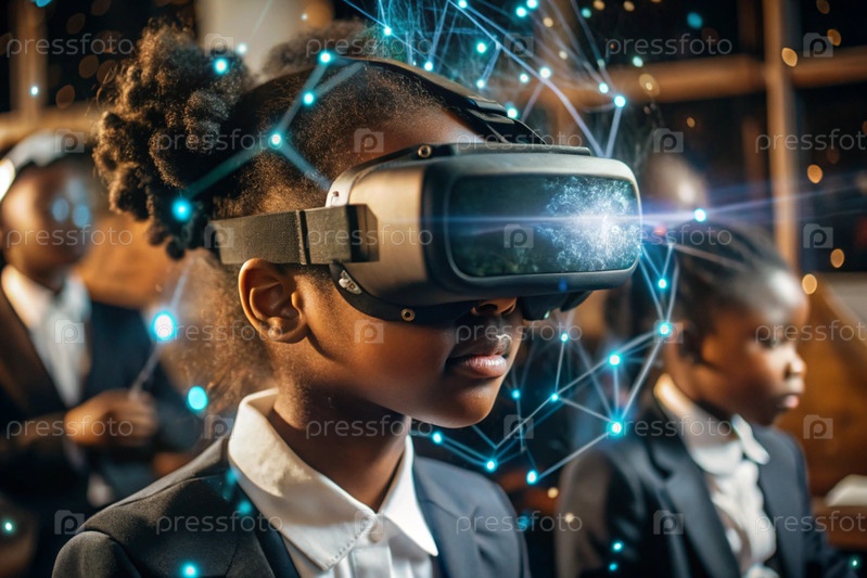 Чернокожая африканская девушка с очками виртуальной реальности.Ребенок находится в классе, а другие ученики на заднем плане.Цифровой интерфейс отображается в наушниках