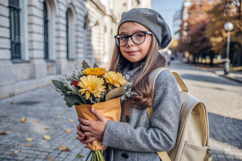 Красивая девушка с очками и букетом осенних цветов впервые идет в школу. Ребенок со школьной сумкой, книгой и цветами. Малыш на городской улице