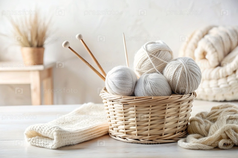 шарики пряжи в корзине из плесеня в белых и бежевых тонах швейная работа, текстиль, вязание зимний сезон, малый бизнес, ручная одежда