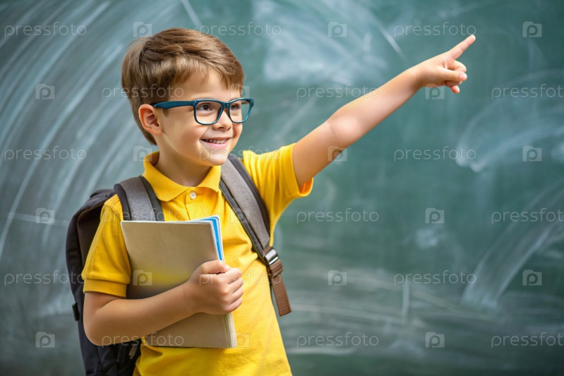 Мальчик с очками показывает класс своей рукой. Ребенок впервые идет в школу. Ребёнок со школьной сумкой и книгой. Ребёнок в классе с доской на заднем плане. Возвращение к школе