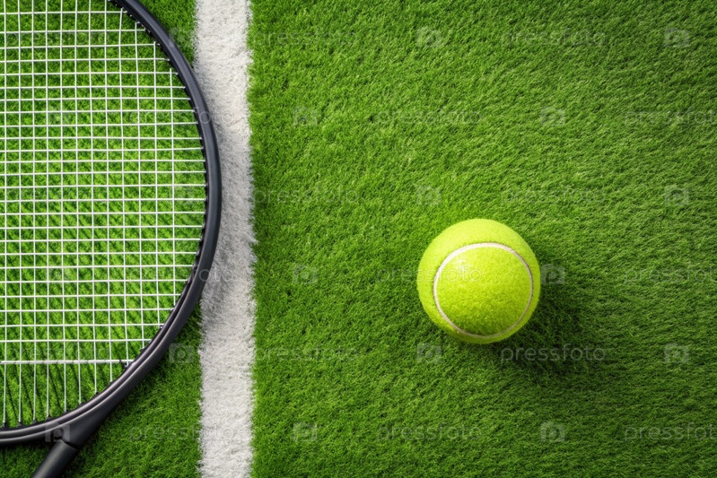 На лужайке жёлтый теннисный мяч и теннисная ракетка, летний вид спорта