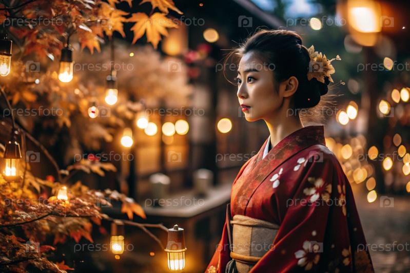 Японская девушка в традиционном национальном костюме - кимоно. На сказочном фоне фонарики и осенние деревья. Портрет символизирует традиции и культуру народа Японии