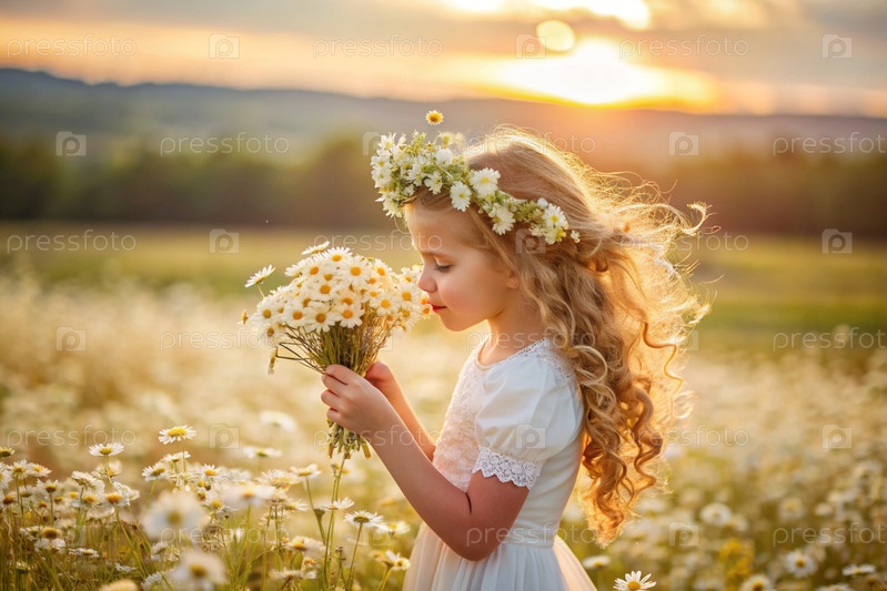 Всероссийский день семьи, любви и верности Красивая маленькая кудрявая девочка в соломенной шляпе с букетом ромашки на фоне поля. День святого Валентина Петра и Февронии