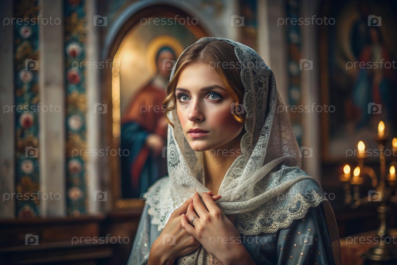 Портрет красивой молодой женщины с платками в православной церкви.Девушка молится в церкви среди икон