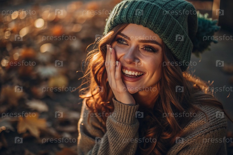 Осенний портрет. Близкий план молодой рыжеволосой женщины с ярко выраженными зелеными глазами в вязанной шляпе и свитере. Девушка смеется под лучами закатывающегося осеннего солнца