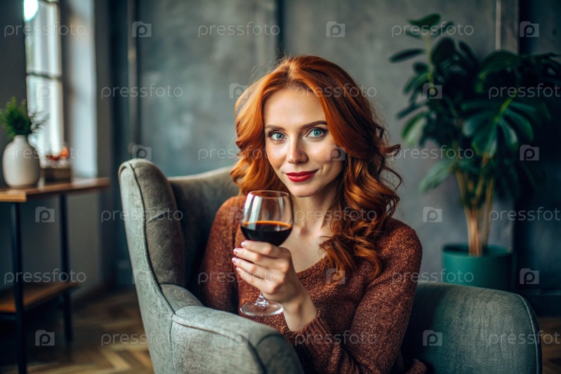 Современная, стильная, красивая женщина с рыжими волосами и бокалом красного вина на стуле в гостиной дома