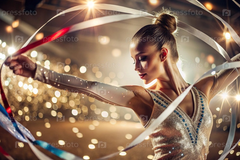 Ритмическая гимнастика - это крупный план красивой гимнастки с лентой в центре внимания на спортивной арене