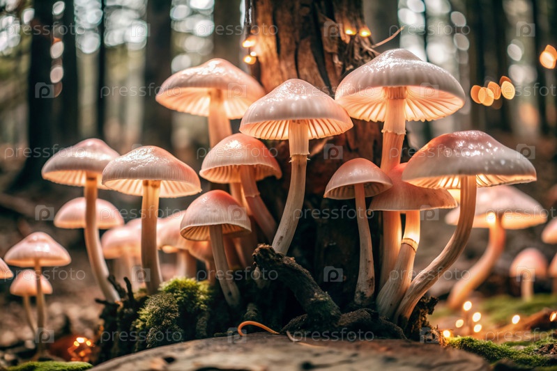 Ядовитые грибы. Жабы. Галлюциногенные грибы. Светящиеся грибы. Изображение для иллюстрации тем, связанных с природой, фантазией, сказками и магией