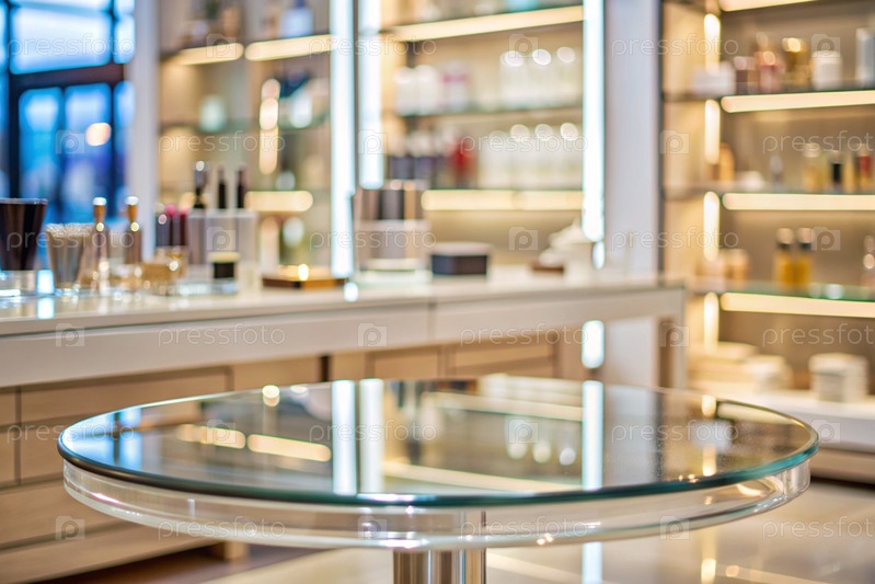 Минимальный фон для демонстрации продукта. Современная стеклянная подиум в современном магазине косметики. Элегантный дизайн для презентации косметической продукции