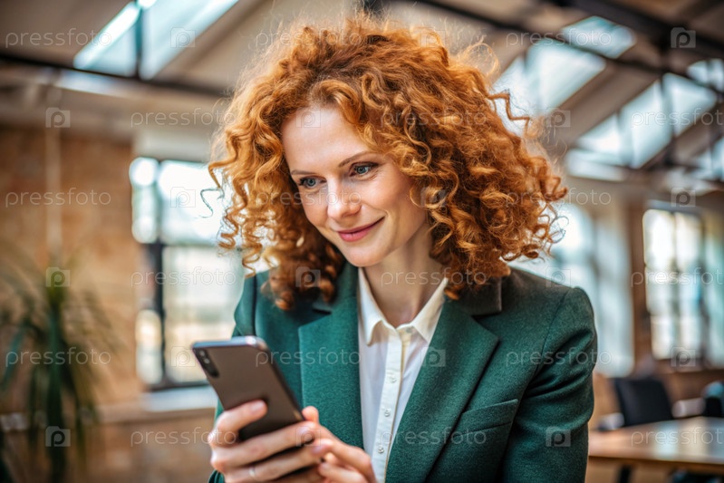 Деловая женщина с локонами красных волос и веснушками. Она одета в обычное зеленое пиджак. В руках смартфон. Небольшой бизнесмен смотрит на свой мобильный телефон