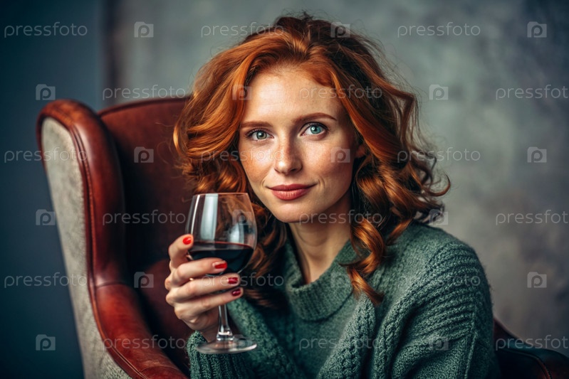 Современная, стильная, красивая женщина с рыжими волосами и бокалом красного вина на стуле в гостиной дома