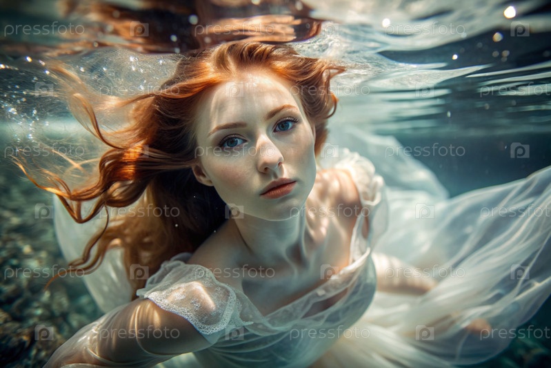 Портрет красивой рыжеволосой девушки в модном белом платье под водой на глубине