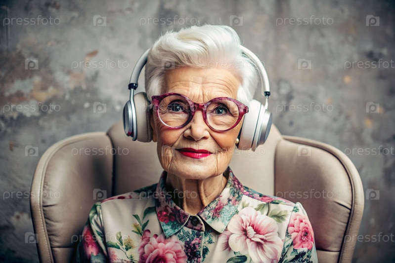 Стильная, современная, счастливая 60-70-летняя женщина слушает музыку в больших беспроводных наушниках дома, на стуле в гостиной