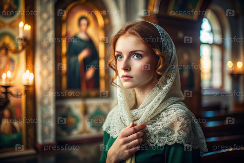 Портрет красивой молодой женщины с платками в православной церкви.Девушка молится в церкви среди икон