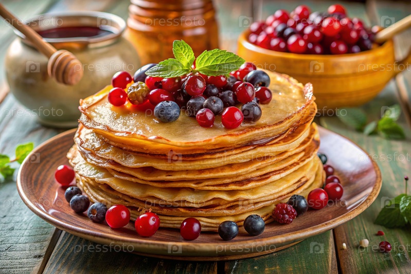 Вкусные блины с медом, ягодами, чернилами, клюквами и малиной.Концепция российского праздника Масленица