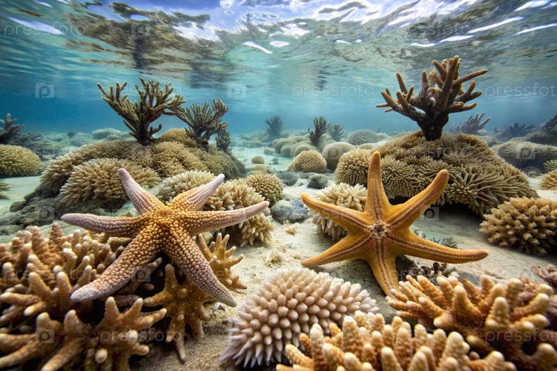 Концепция летних каникул. Подводный мир. Кораллы и морские звезды под водой. Красивый абстрактный фон для баннера