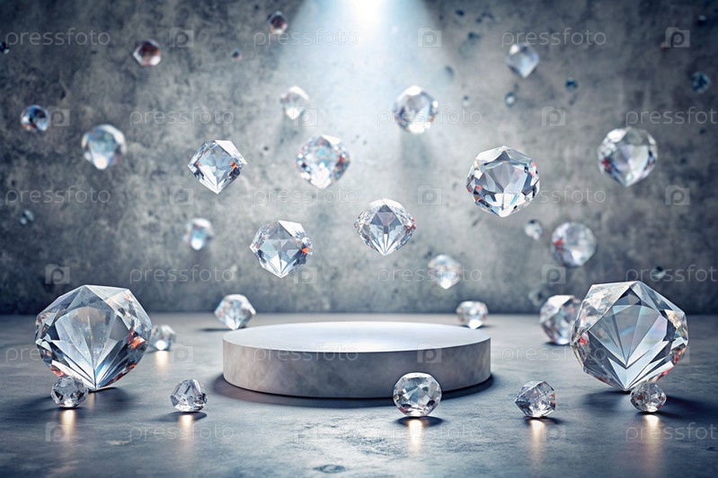 Минималистский фон для выставки ювелирных изделий. Современный пустой подиум с серой стеной и бриллиантами. Креативный дизайн презентации продукта