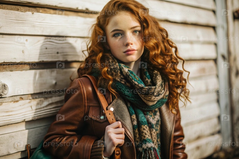 Осенний портрет. Близкий план молодой рыжеволосой женщины с выразительными зелеными глазами в коричневом кожаном куртке и бирюзовом шарфе
