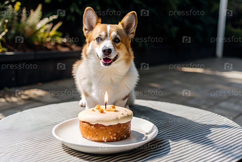 Собака сидит с тортом, воздушными шарами и флагами на вечеринке по случаю дня рождения