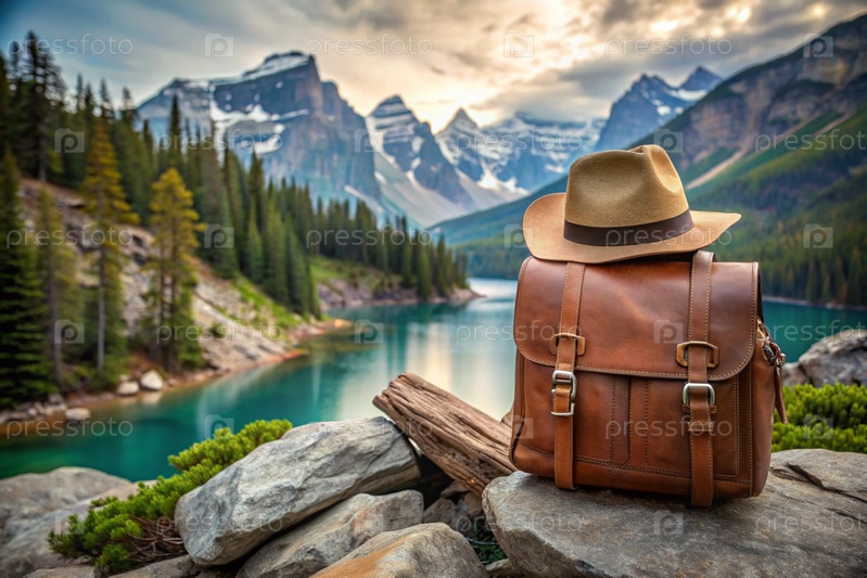 Стильный коричневый кожаный рюкзак и шляпа на фоне живописного озера и гор